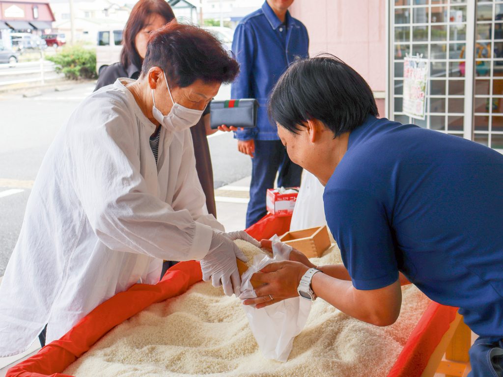 ほうせん館は「新米フェア」を開きました。来店者に管内産の新米「コシヒカリ」で作ったおにぎりを振る舞った他、「新米すくい」も行いました。「新米すくい」では、120kgの新米を用意。五合升にどれだけ多くの米を盛ることができるか挑戦する参加者の姿が見られました。参加者は「難しかったけれど、楽しかった」「購入するよりも安く手に入るのでうれしい」と笑顔を見せました。吉村学店長は「たくさんの来店者が『新米すくい』に参加し、楽しんでもらえました。管内産の新米を味わってほしいです」と話しました。