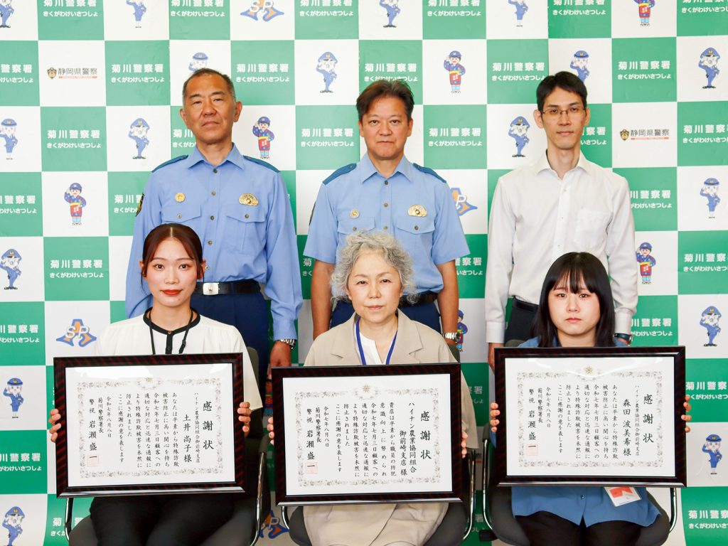 御前崎支店は、詐欺被害の防止に貢献したとして菊川警察署から感謝状を受け取りました。