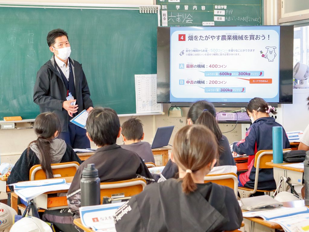 金融企画課は、萩間小学校5年生を対象に金融教育を行いました。講師を務めた松林係長から説明を受け、児童らは、農家になったつもりで農業経営をシミュレーション。野菜の収穫量とお金の出入りを記録しながら、お金の使い方、JAの役割、農業経営について学びました。