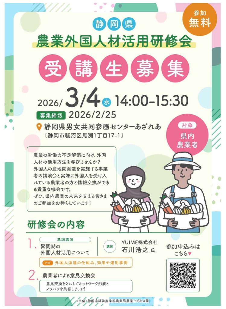 静岡県では、農業分野における外国人材の活躍を推進するため、「農業外国人材活用研修会」を開催します。外国人の産地間派遣を実施する事業者の講演会と実際に外国人を受け入れている農業者の方と情報交換ができる貴重な機会となっています。ぜひご参加ください。