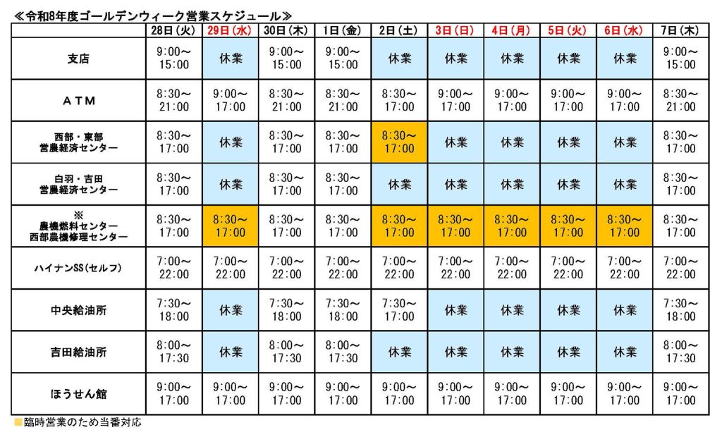 令和8年度ゴールデンウィークの営業スケジュールをお知らせします